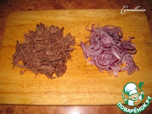 Говядину отварить в подсоленной воде, остудить. Мясо разобрать на волокна руками или нарезать острым ножом тонкими полосочками.