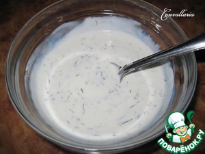 Заправка: смешать сметану, зернистую горчицу, мелко нарезанный укроп, добавить молотый перец по вкусу.