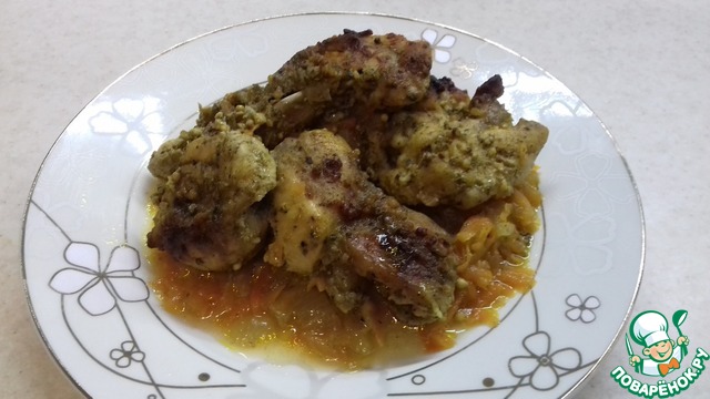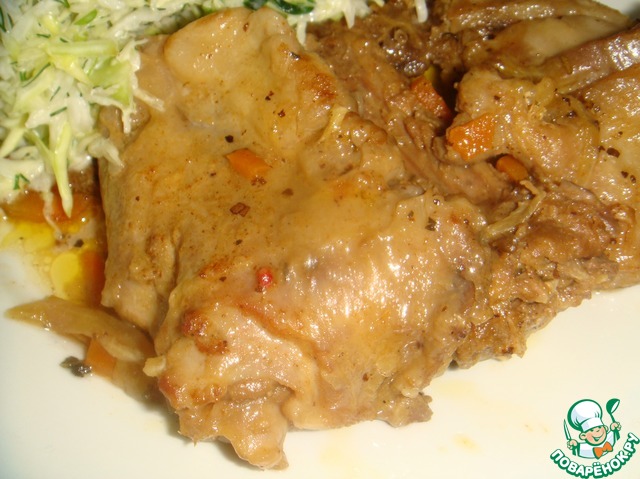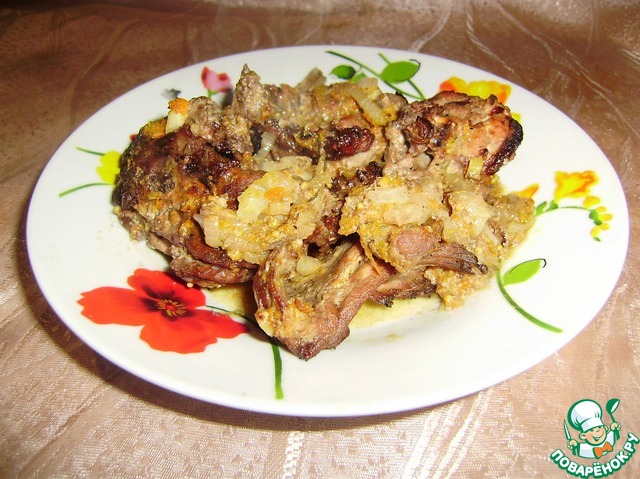 Порционно нарезать кролика, каждый кусок промазать горчично-сметанной смесью и оставить мариноваться на 3 часа (я оставила на ночь)