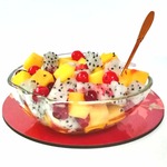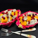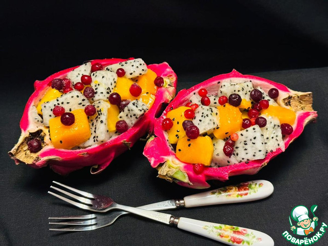 Выложить кубики фруктов в чашечку от питахайи, посыпать ягодами клюквы, полить соусом, украсить листиком мяты, и можно подавать