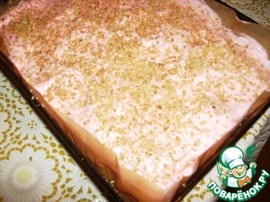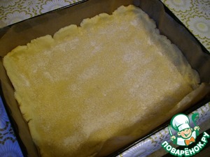 Форму выстилать пергаментом, хорошо распределить белое тесто, присыпать сухарями или манкой.