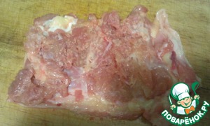 Берем бедрышки и вырезаем косточку. У нас остается мякоть на кожице, которую мы немного отбиваем, солим и перчим.
