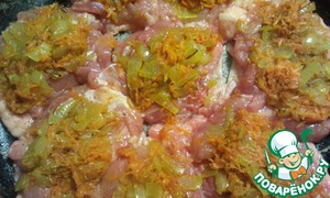 Отбивные кладем на сковородку вниз кожей (можно каждый разрезать пополам, как сделала я). Сверху выкладываем зажарку.