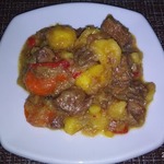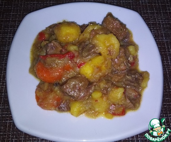 Затем доливаем воды, поочередно закладываем помидор, морковь, картофель. Все порезано крупно. Солим, перчим, кладем лаврушку, закрываем крышкой и томим на небольшом огне не менее часа. В самом конце перед снятием с огня на свое усмотрение можно добавить и рубленый чеснок, и любую зелень по вкусу.