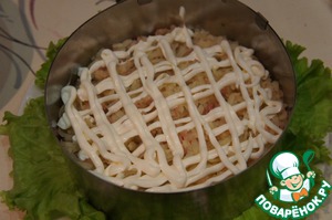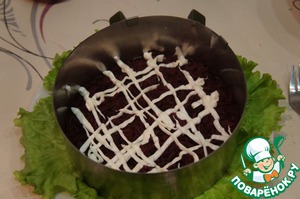 Итак, плоское блюдо застелить листьями зеленого салата. Если свекла слишком сочная, надо отцедить лишний сок, чтобы салат не потек. Первым слоем выложить свеклу. Сверху нанести сеточку из майонеза. -