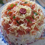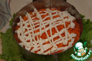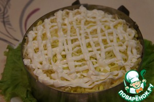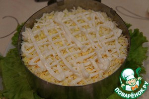 Половину белка одного яйца отложить для украшения. Остальное выложить следующим слоем. Нанести сеточку из майонеза.