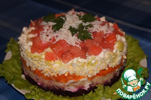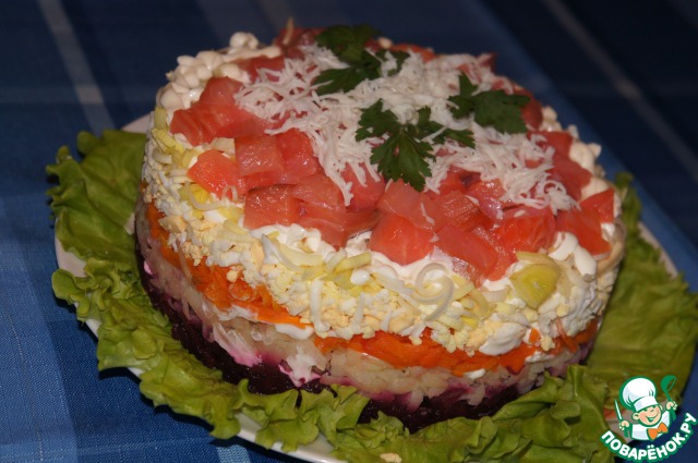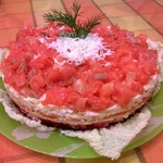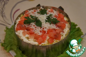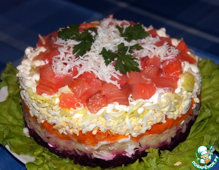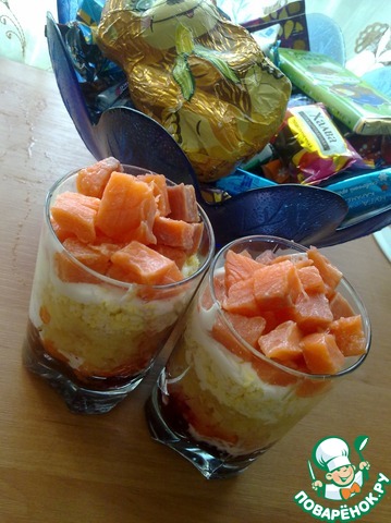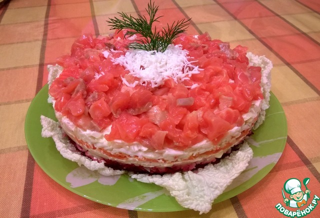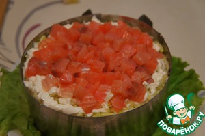 И, наконец, последним слоем выложить семгу, нарезанную маленькими кубиками. Её надо выложить немного горочкой.