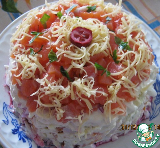 Затем аккуратно удалить кольцо, если оно использовалось и можно подавать салат на стол.