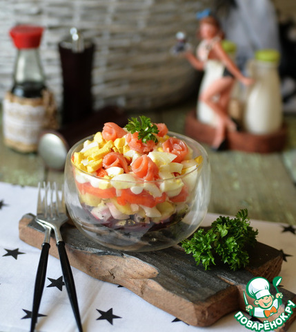 В селедке под щубой Селедку можно заменить ЛЮБОЙ соленой/малосольной\маринованной\.... и прочей аналогичной рыбой.ЛЮБОЙ. Будет это селедка или лосось, или семга,или ... суть рецепта не меняется. Как и вкус. Слоеный салат с соленой рыбой. ВСЕ!