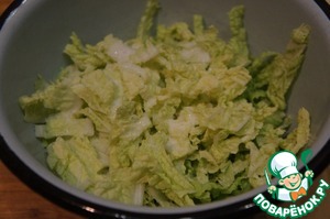 Окорок нарезать маленькими кубиками. У капусты вырезать толстые части листьев, а мягкие нашинковать.