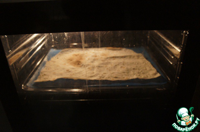 Духовку разогреть до 160*С. Лаваш разрезать пополам, одну половину поместить в духовку на 1 минуту.