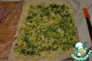 Застелить стол пленкой, выложить лаваш, равномерным слоем распределить по нему рис. Густо посыпать мелко нарезанной зеленью.