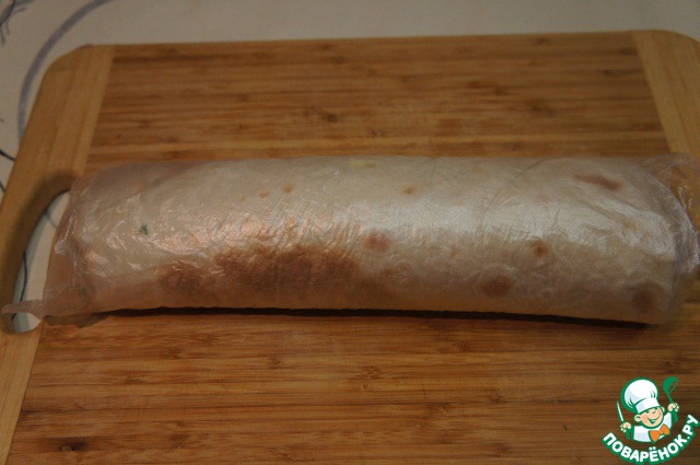 При помощи пленки аккуратно свернуть лаваш в рулет, плотно прижимая его руками и подворачивая боковые концы пленки, чтобы начинка не вываливалась.