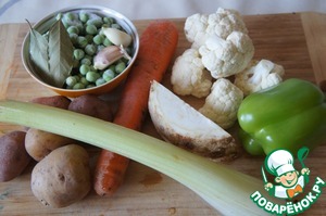 Морковь и сельдерей очистить и нарезать соломкой. Картофель - брусочками. Черешок сельдерея - тонкими ломтиками, болгарский перец - кусочками. Цветную капусту разобрать на маленькие соцветия. Лук и чеснок нарезать очень мелко.
