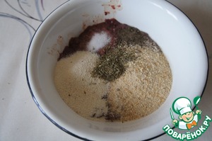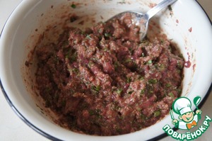 Смешать печенку со взбитым вилкой яйцом, панировочными сухарями, манкой, солью, майораном, перцем. По желанию можно добавить мелко нарезанной зелени укропа и петрушки. Дать массе отдохнуть 15-20 мин.