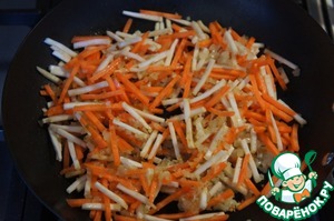 Добавить морковь с сельдерем и спассеровать до мягкости.