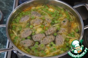 При подаче приправить суп черным и острым красным перцем по вкусу.