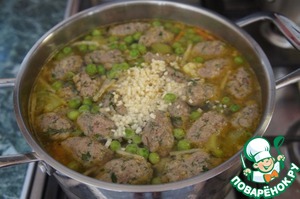 Выключить огонь, добавить измельченный (лучше это сделать ножом, а не через пресс) чеснок, накрыть суп крышкой и дать настояться 10 минут.