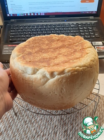 После сигнала хлеб нужно аккуратно перевернуть. Я обернула верх чаши полотенцем и аккуратно перевернула. Затем хлеб опустить обратно в чашу румяной стороной к верху.