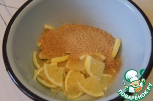 А сам лимон порезать на тонкие ломтики, затем на четвертинки, удалить косточки и засыпать 100 г сахара.