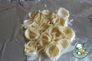 Берем фольгу, смазываем растительным маслом. И все ингредиенты выкладываем слоями. Сначала выкладываем картофель.