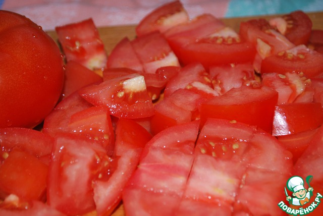 Затем моем и режем крупными кубиками помидоры, засыпаем их солью и сахаром.