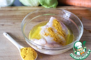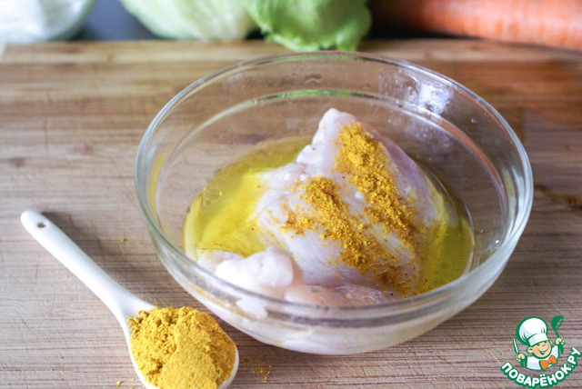 Замариновать куриную грудку в столовой ложке оливкового масла с соком половинки лимона, щедро добавив карри, для последующего обжаривания *
