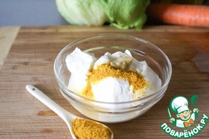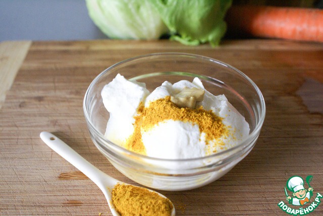 Приготовить заправку: в натуральный йогурт (я использую греческий) добавить сок второй половинки лимона, ложку карри и пол-чайной ложки сладкой (дижонской) горчицы. Перемешать.
