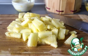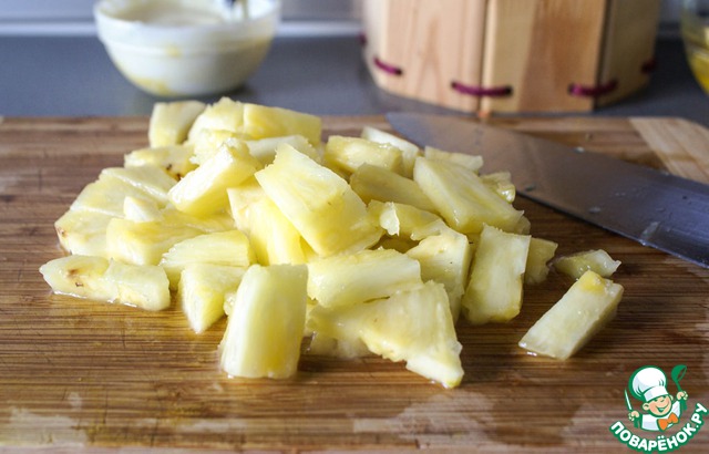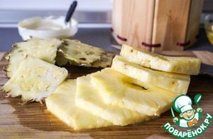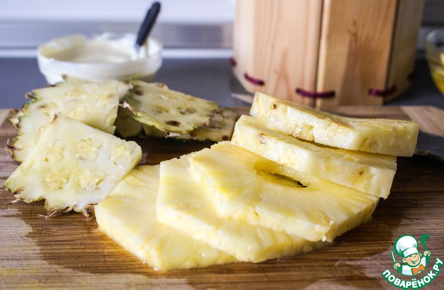 С ананаса срезать корки, извлечь серединку и нарезать кольцами.