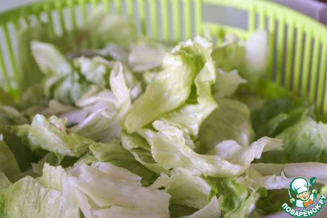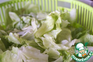 Листья салата промыть и просушить. Затем крупно нарвать руками.