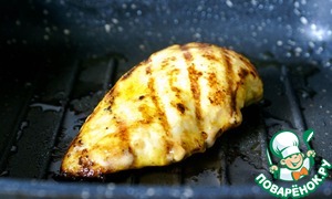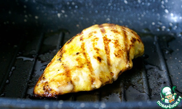 Очень хорошо разогреть сковороду гриль и выложить на нее куриную грудку. Я жарю на сухой сковороде по 3-4 минуты с каждой стороны. После обжаривания второй стороны выключаю огонь и оставляю мясо "доходить". Сильный нагрев позволяет мясу "запечататься", благодаря моментально образующейся корочке, и сохраняет все его соки внутри. Такой способ приготовления никогда не позволит вам получить сухую куриную грудку, а также полностью сохранит все ее полезные и питательные свойства.