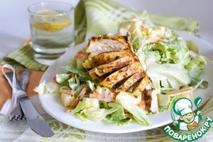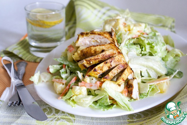 Готовую куриную грудку нарезать поперек волокон наискосок и перемешать с салатом. Либо выложить нарезанную грудку прямо на готовый салат. Вкус можно регулировать под себя путем добавления карри, лимонного сока и/или горчицы. Никакой соли этот салат не требует. Он одинаково хорош как с теплой курицей, так и с полностью остывшей. Заправлять этот салат следует только перед подачей.