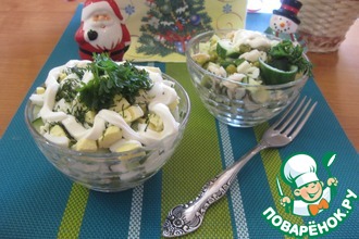 В то время как обжаривается куриная грудка, смешать в глубокой миске все предварительно подготовленные ингредиенты, заправить йогуртовым соусом и перемешать.