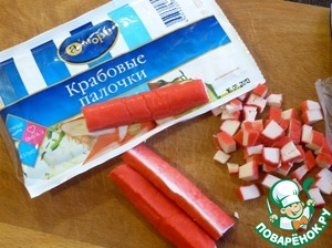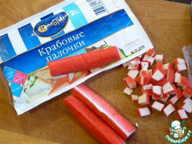 - Крабовые палочки (половина упаковки крабовых палочек торговой марки А’море) — 5 шт
