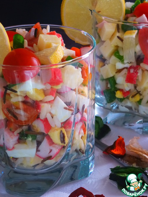 Видимо, я первопроходец в этом конкурсе, т. е самая смелая…..! Предлагаю на Ваш суд легкий салатик с крабовыми палочками торговой марки А’море. Эффектно смотрится на праздничном столе. Угощайтесь.