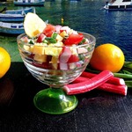 С 1.4 лимона снять цедру и выдавить сок. Сок и цедру половины лимона смешать с оливковым маслом и заправить салат.
