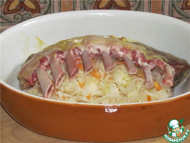 Капусту выложить в форму для запекания, над ней "домиком" поставить каре, накрыть фольгой и в духовку на 1 час (180*)