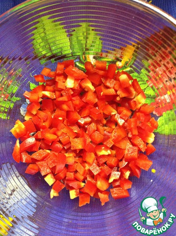Перец (1 шт.) режем кубиками и укладываем на дно чаши. -