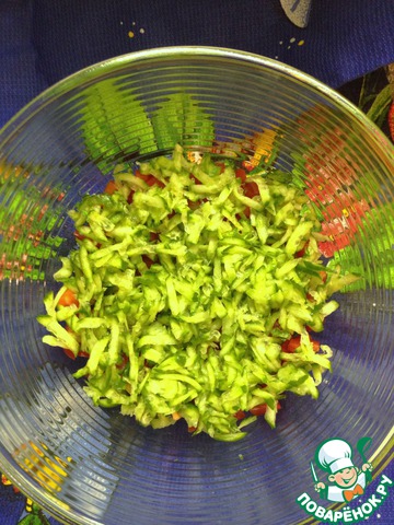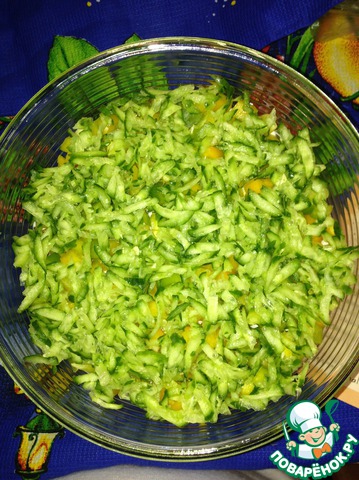 Огурец (1/2 нормы) натереть на крупной терке. Отжать и выложить сверху на перец. -