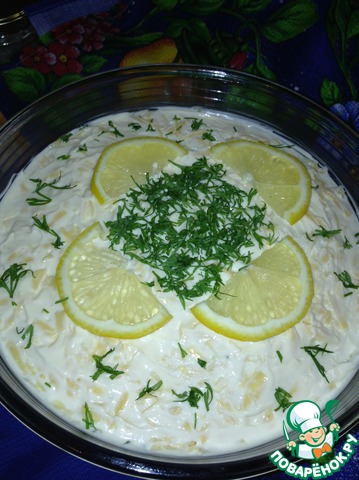 Сверху салат можно украсить лимоном, зеленью и маслинами (по желанию).