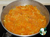 Лук режем полукольцами, морковь трем на терке. Слегка обжариваем лук на оливковом масле, добавляем морковь. Накрываем крышкой и тушим на слабом огне до мягкости моркови (минут 15). Даем остыть.