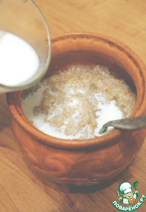 Вскипятить молоко и влить его понемногу в сваренную кашу, помешивая. Молока также брала меньше, столько же, сколько воды, когда заливала крупу. Молоко использовала 3,2 % жирности