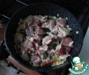Лук поджарить на оливковом масле, добавить свинину. Обжарить. Налить немного воды.