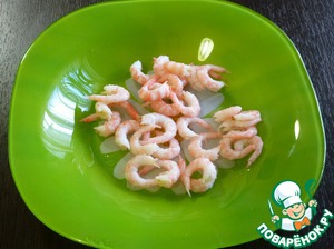 • В 50 мл кипяченой охлажденной воды замочить желатин на 20-30 минут. Отварить и почистить креветки.