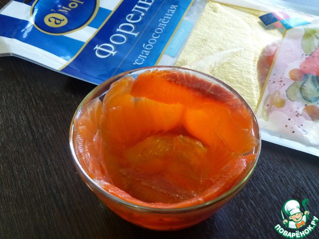 • В форму для заливного выложить филе слабосоленой форели. Нагреть желатин до полного растворения (но не кипятить), добавить его в рыбный бульон. Смешать кукурузу, крабовые палочки, креветки, зелень и бульон, вылить в форму и отправить в холодильник до полного застывания.