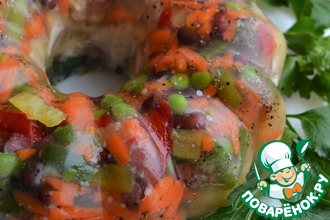 Вчера к нам из Бишкека приехали родственники, соответственно был организован праздничный стол. Одно из блюд, которое присутствовало на праздничном столе, я хочу предложить и Вам. Заливное получилось очень пикантное и красивое.