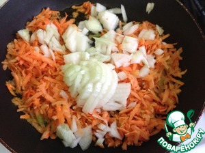 Ставим варить рис. Лук мелко режем кубиками, морковь натираем на терке и ставим обжаривать с 1 ст. л. оливкового масла.