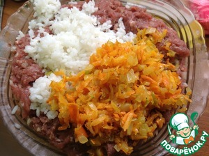 В фарш добавляем остывший рис и морковь с луком, перемешиваем