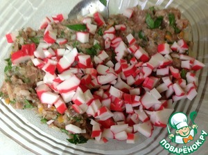 Добавляем нарезанные кубиками крабовые палочки, перемешиваем фарш