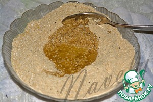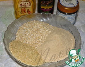 Перемешиваем сухие ингредиенты. Отдельно в 80 мл. воды добавляем кунжутное масло и сироп топинамбура или мед (кленовый сироп)
